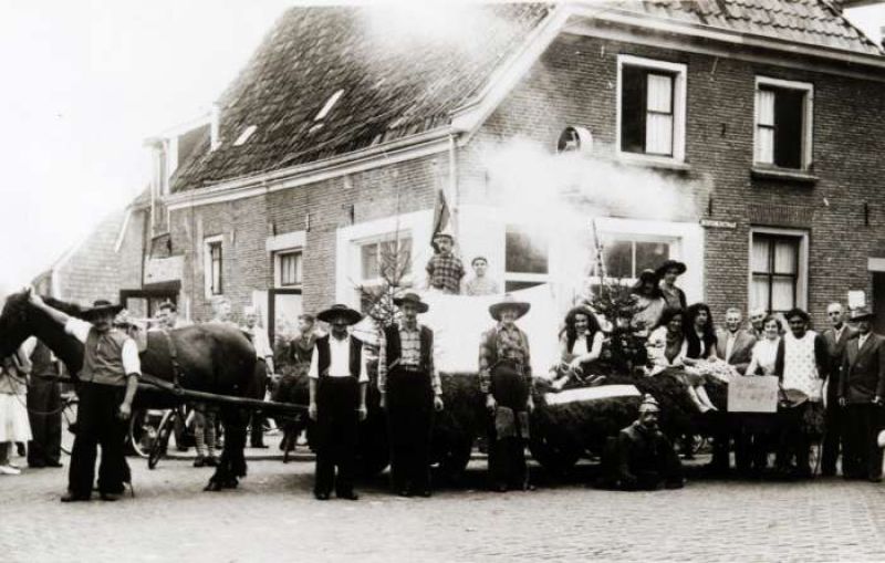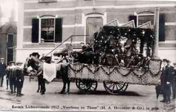 De versierde wagen (1e prijs) van H.A. Hulshof & Co voor van het gemeentehuis. T
