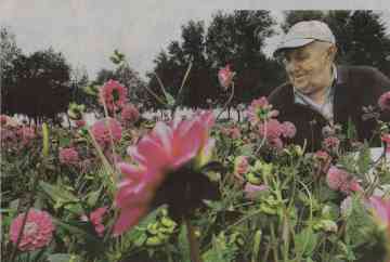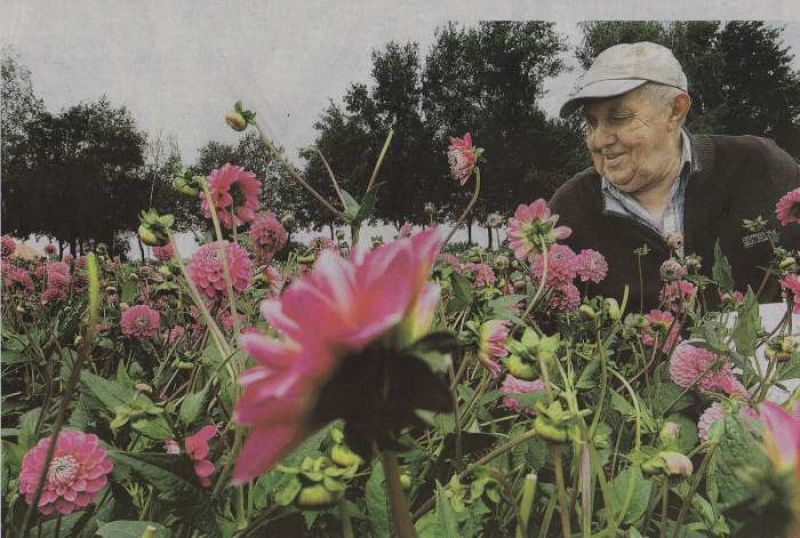 Benny Olyslager plukt dahlia`s voor het bloemencorso