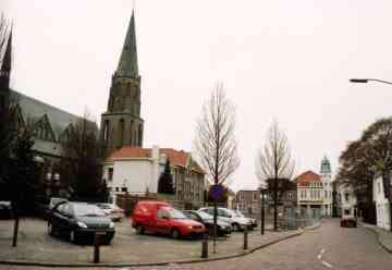De Broekboomstraat richting de Rapenburgsestraat. Links de St.-Bonifatiuskerk me