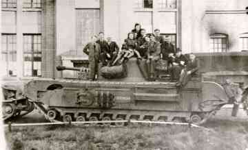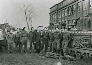 Bij de foto: Enige dagen na de bevrijding op 31 maart 1945 staat er een Engelse tank op het bedrijfsterrein van Hulhofs Ver. Fabrieken aan de Aaltenseweg. Mensen van personeelszaken bij de soldaten op de tank.