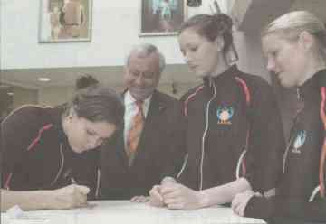 De selectie van het eerste damesvolleybalteam Longa `59 aplaudiseert voor de nie