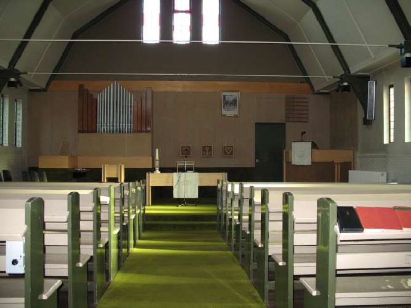 Het interieur van de Gereformeerde Kerk aan de Nieuwe Maat te Lichtenvoorde. Voo