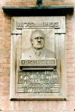 Deze gedenksteen met het portret van de oprichter van de schoenfabriek H.B. Ster