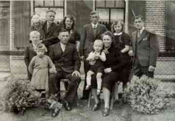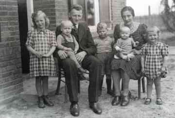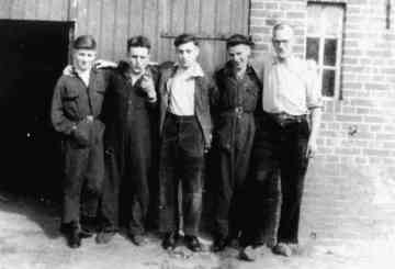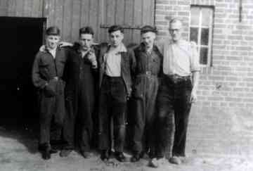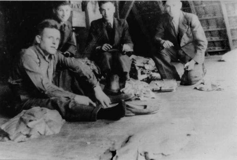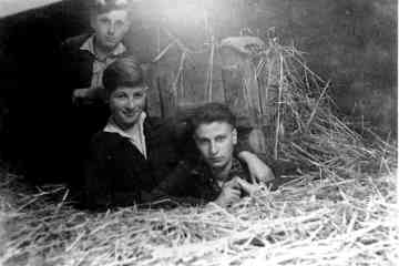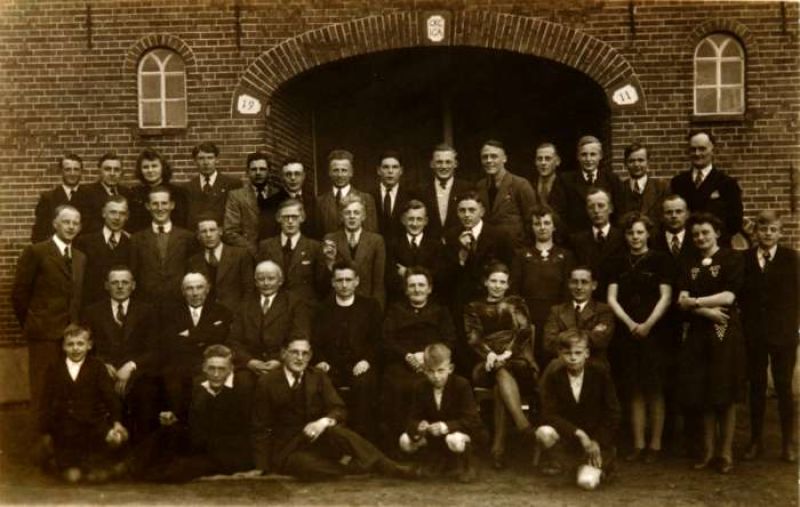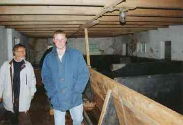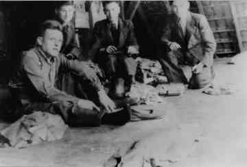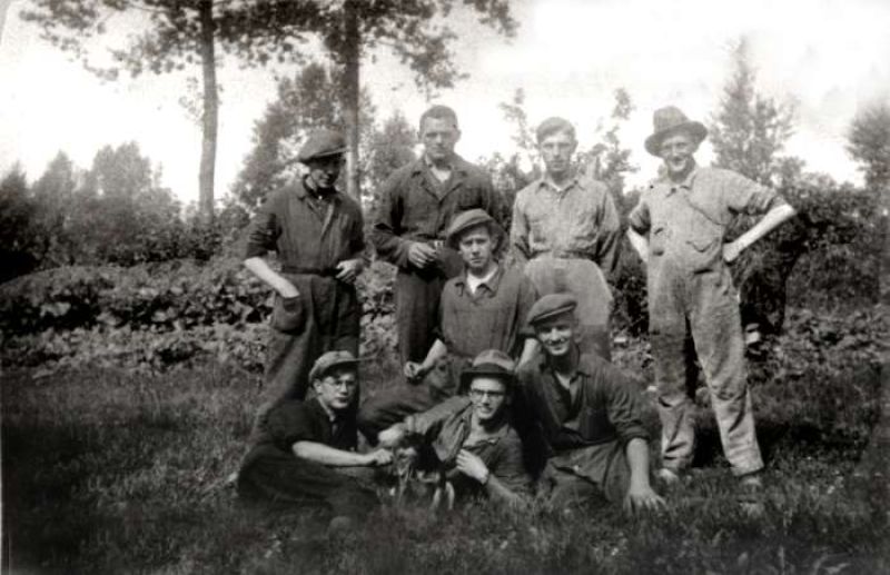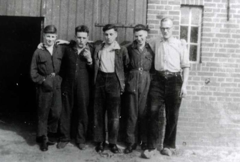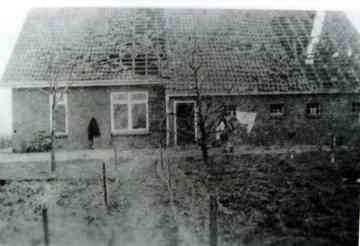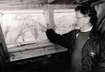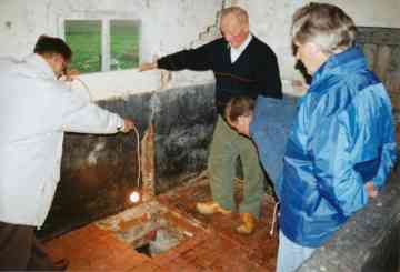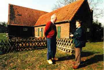 Bij de foto: Een delegatie van de VOL bezoekt de onderduikersboerderij van de fam. W.Geurink, Martin Leliveltstraat 82. De boerderij staat op de nominatie om afgebroken te worden. Enige mensen waaronder dhr.J.Scholten spannen zich in om deze historiche plek te behouden. Hier bij de ingang naar het onderduikershol (2½ x 2½ meter onder de grond achter de varkensschuur). Op de foto van links naar rechts: Jan Scholten (initiatiefnemer) - Willem Geurink (83jaar) - Benno van Lochem (v.o.l./werkgroep) - Henny Bennink (v.o.l./werkgroep).