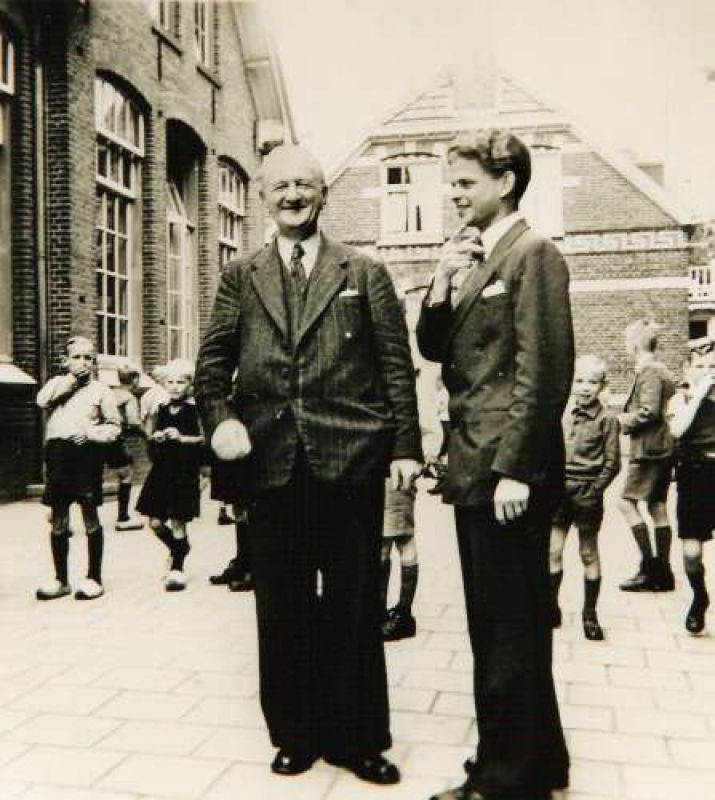 Onderwijzers en leerlingen op het schoolplein van de jongensschool aan de Varsse