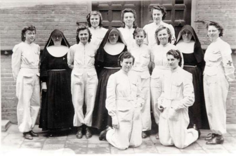 De helpsters van het Rode Kruis direct na de oorlog. de meisjesschool was gevord