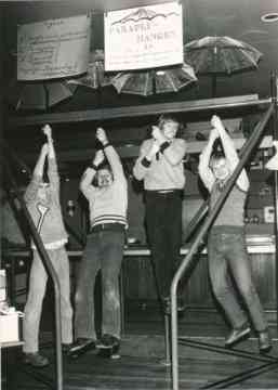 Paraplu hangen op schutters Fancy Fair op 2 april 1979 i.v.m. 50 jarig jubileum