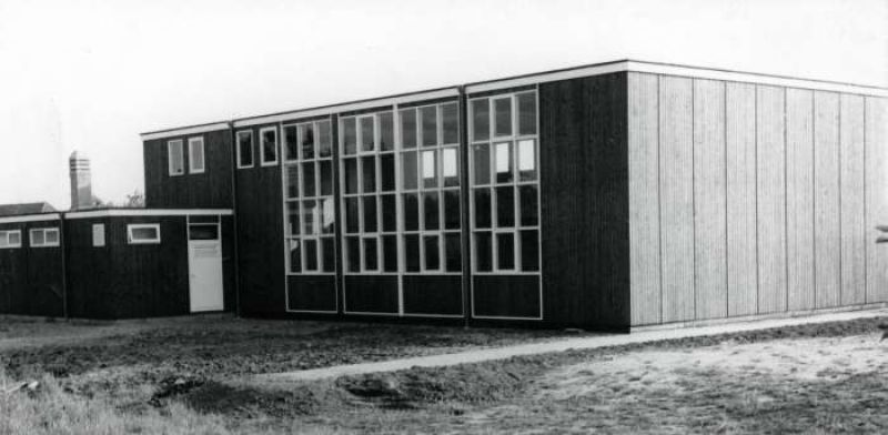 De houten gymzaal in 1968 op de hoek van de Ds. v. Krevelenstraat en de Goudenre