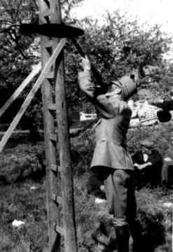 De heer Jan Olijslager (*1887- 1977) schiet op de vogel op de Lievelder kermis.