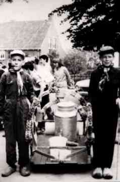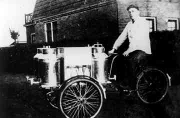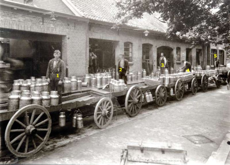 Melkrijders bij de afgifte van de volle melkbussen, hier nog met de oude, smalle