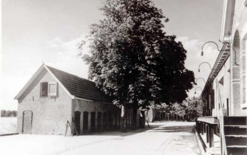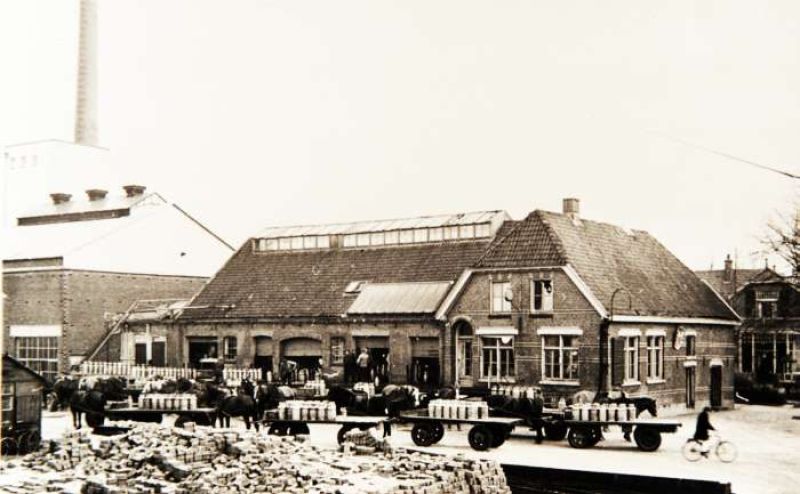 De paardenstallen (rond 1935) opzij van de coöp zuivelfabriek bij het melkafgif
