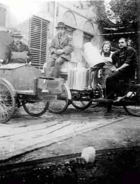 Melkventers halen melk bij de fabriek (Botterfabriek), om te verkopen rond 1940.