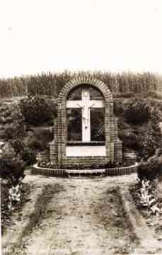 Het wegkruis is in 1946 onthuld. De ontwerper is onbekend. Het kruis staat onder een gemetselde rondboog met twee steunberen op een betegeld basement. Het kruis is van beton met daarop een houten corpus met los INRI-tablet. In de basis is een steen gemetseld met het opschrift: ‘O Jezus, geef Uw milden zegen, aan hen, die gaan langs deze wegen.’